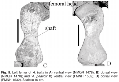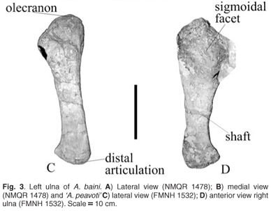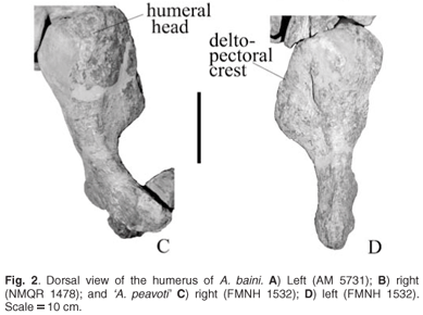 There are also similarities between the skeletal elements. Neither taxon has a scapula spine present. The olecranon fossa in A. baini and 'A. peavoti' forms a very shallow concave surface. There are similarities in the femora of these taxa. The proximal expansion is rectangular in both and the greater trochanter is parallel to the long axis of the bone. In A. baini and 'A. peavoti' (based on the right femur) the femoral head is separated from the greater trochanter and raised above the surface of the bone; the articulating surface is directed antero-dorsally.