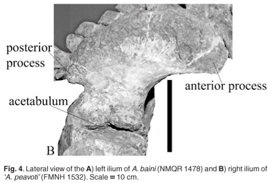 The ilium blade narrows towards the acetabulum to form a neck. It is short, broad and fairly robust. The neck of the ilium is also slightly longer and narrower in A. baini (NMQR 1478) than in 'A. peavoti' (FMNH 1532). Below the neck the acetabulum is restricted to the anterior two-thirds of the distal end of the ilium. It is almost circular with a rugose, concave surface that is directed postero-laterally. The supra-acetabular ridge is narrow and has a notch about two-thirds of the way posteriorly. The ischial articulation is larger than that for the pubis.