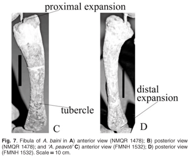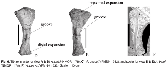 Both the left and right tibiae of A. baini (NMQR 1478) are preserved and are complete. The lateral border is convex whereas the medial is concave (Fig. 6A, B, D, E). In proximal view the articulating surface has a triangular appearance. Proximally, the tibia of 'A. peavoti' (Fig. 6C, F) is more widely expanded than that of A. baini. Posterior to the tibial process are two concave articulating facets with the medial one larger and slightly more concave. The tibial process is not very prominent but is an elongated oval with a rugose convex surface (Fig. 6A, B).