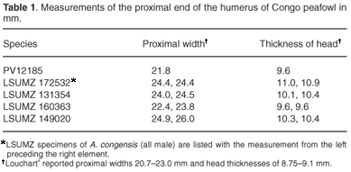 The fossil's capital incisure is deeper and a more narrow 'V' than in Pavo. The depth and extent of the capital incisure varies among individuals of A. congensis. In Louisiana State University Museum of Zoology (LSUMZ) 131354, the incisure does not undercut the humeral head, as in the fossil specimen (Fig. 1). However, in LSUMZ 172532 the incisure excavates into the ventral side of the head. The fossil specimen's bicipital crest's ventral (distal) margin lacks the more concave shape of Argusianus and Rheinhardia.4 The morphology of the dorsal tubercle is similar to Pavo cristatus, but the fossil most closely resembles that of extant individuals of Afropavo congensis.