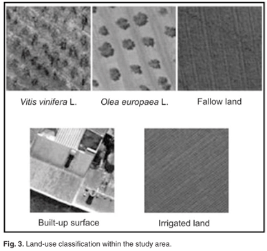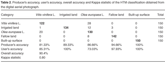 The methodology proposed was applied to the region of study obtaining a final classification of land use. Table 2 shows the accuracy of classification in the digital aerial photograph according to its boundary analysis. The highest producer's accuracy was achieved for the 'built-up surface', having a value of 100%, while the lowest producer's accuracy was for 'Vitis vinifera L.' (81.33%).