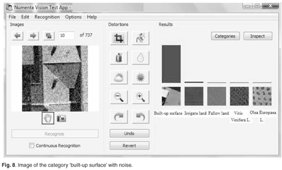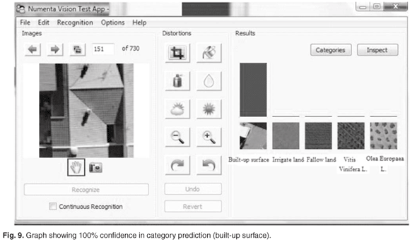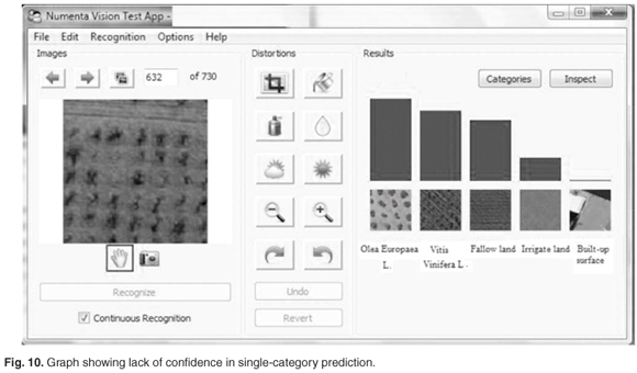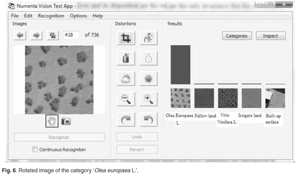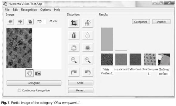 We observed that the system performed better overall while recognising complex images, which have more discernible features, such as corners and line intersections. For example, images of 'fallow land' and 'irrigated land' were not recognised as easily as 'built-up surface' or 'Vitis vinifera L.'. The system also sometimes tended to confuse categories sharing many similar shapes, such as 'Vitis vinifera L.' and 'Olea europaea L.'. We also observed that the recognition performance was slowly degraded when more categories were introduced in training, arising from the same confusion between similar images. For example, we tried to classify different irrigated crops (Phaseolus vulgaris L., Triticum aestivum L., Vicia faba L. and Pisum sativum L.), but the analysis and result showed a small overall accuracy of 69.65% and a Kappa Statistic of 0.72.