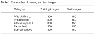 A map of crops and exploitation of the region of Huelva (2007) was used to carry out the 'training' of the classification and its subsequent validation. The land use in this area is classified as: Vitis vinifera L. (vineyards), Olea europaea L. (olive groves), fallow land, irrigated land and built-up surface (Fig. 3). Table 1 shows the number of training and test images for the architecture demonstration.