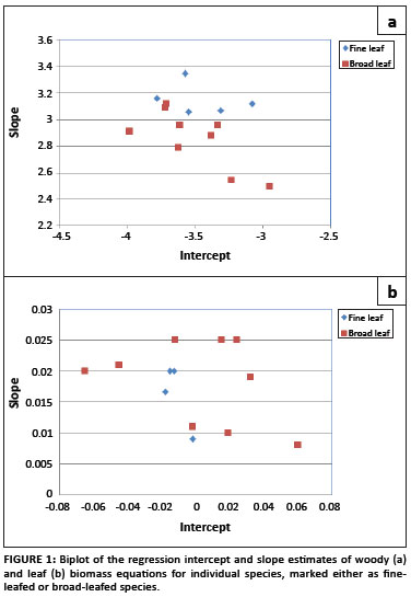 Allometric data sets were not available for all tree species present at the site, and therefore it was necessary to derive general equations from the data sets which were available for other savannah tree species. For the woody biomass general equation, a biplot of the regression parameters for the species-specific equations showed two clear groups: one applicable to broad-leafed species and the other to fine-leafed species (Figure 1), and therefore two separate general equations were derived. The species data sets used to derive the woody biomass equation for fine-leafed trees were A. nigrescens,36 A. nilotica, A. grandicornuta, A. luederitzii and Dichrostachys cinerea.37 To derive the equation for the broad-leafed species, allometric data sets for C. apiculatum, S. birrea, Colophospermum mopane,36 C. molle,Euclea schimperi, E. divinorum,Sideroxylon inerme, Spirostachys africana, Terminalia sericea, Balanites maughamii, Cassine aethiopica and Ziziphus mucronata37 were used. When the regression parameters of the leaf biomass equations were plotted against each other, no clear groups were distinguishable (Figure 1), and therefore only one general equation for leaf biomass was derived, pooling the data from all available species.