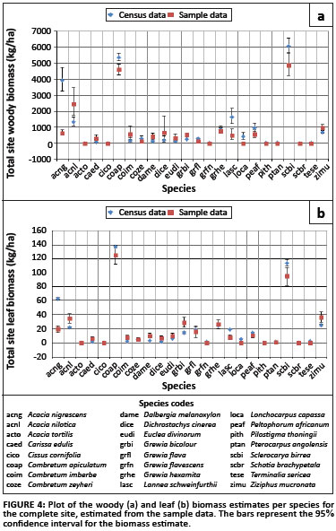 The biomass estimates obtained from the sample data compared to those derived from the census data (Figure 4), are generally quite similar, with the confidence intervals for the estimates overlapping. A notable exception is A. nigrescens, which, if the census data can be assumed to be correct, is dramatically underestimated by the sample data. L. schweinfurthii and L. capassa are also somewhat underestimated, but not quite as severely as A. nigrescens. This error could be as a result of an inappropriate sampling strategy, resulting in non-representation of A. nigrescens. The sampling strategy employed in this case placed the sampling plots on the intersection points of an evenly spaced grid, so that the points were 50 m apart. Because the trees in a savannah landscape can be clustered together, the selection of sampling plots may have been on the same scale as the natural clustering in the landscape, thereby consistently leaving out the A. nigrescens trees, which are a significant component of this system.