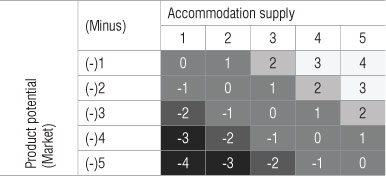 5. Finally, GIS was used to match the tourism product pattern (market) with the establishment (plant) image by subtracting product potential (market) values from plant (accommodation facilities) provision values according to the scheme shown in Figure 5. The result is a set of values ranging between -4 (undersupply) and +4 (oversupply of facilities). The resulting gap image displays this shading range to indicate towns with relative under- or overprovision.