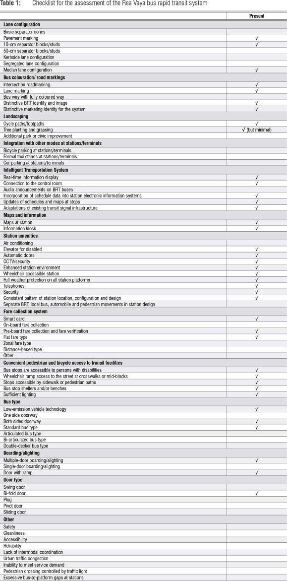 We assessed the performance of the system and its possible pros and cons on-site using a checklist (Table 1). The Rea Vaya BRT system makes use of a median bidirectional BRT lane configuration which is located in the middle of the roadway, as an exclusive right-of-way with pavement and lane markings, intersection road markings and stud separators (10 cm). The stud separators serve to separate the other traffic to avoid vehicle manoeuvre. It has distinctive branding in the form of markings on the vehicle that differentiate it from other public transport systems. The standard bus is fitted with low-emission technology, bi-fold doors at both sides and multiple entrances for boarding and alighting.