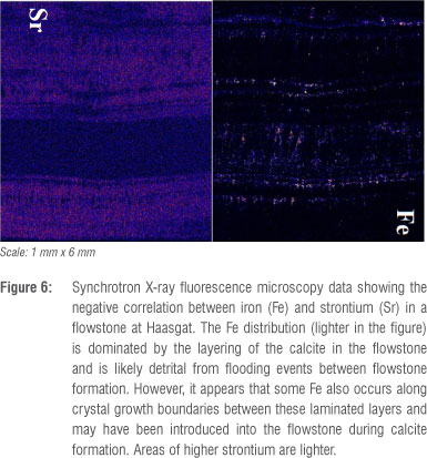 X-ray fluorescence microscopy (XFM) studies at the Australian Synchrotron indicate that the majority of iron (Fe) phases occur as discrete horizontal bands within the flowstone (Figure 6) and correlate with higher concentrations of arsenic (Figure 7), which has been suggested to correlate to warmer, more humid phases with increased erosion.49 This finding is further confirmed by the presence of manganese-bearing structures and their co-location with arsenic (Figure 7), the former of which would have come from greater dissolution of the dolomite host rock.
