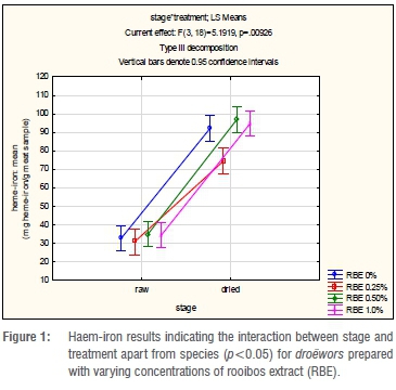 The mean values for the haem-iron concentration in the droëwors samples are depicted in Table 4. The treatments of blesbok and springbok species droëwors had similar initial haem-iron concentrations that increased after drying. Furthermore, after drying all treatments had similar haem-iron concentrations over all species types. Meat with RBE 0.25% had lower (p<0.05) haem-iron concentrations after drying for all species as noted in Table 4 and Figure 1. There were no significant differences between the species (p=0.685), therefore it would be acceptable to analyse the interaction (p=0.00926) between stage and treatment regardless of species, as seen in Figure 1. RBE 0.25% therefore had the lowest increase, which corresponds with the results of lipid oxidation given in Table 5. Although it was expected that the haem-iron would differ between raw and dry droëwors, when expressed on a dry mass basis, the droëwors still had higher haem-iron than the raw droëwors (Table 4).