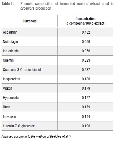 Fermented rooibos extract was used and prepared as per the procedure reported by Joubert et al.15 The phenolic composition of the rooibos extract (Table 1) was analysed according to the method of Beelders et al.16 through an optimised reversed phase liquid chromatographic (RP-LC) separation technique.