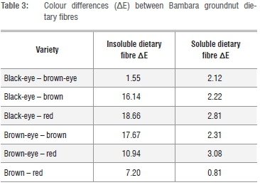 The water holding capacity (WHC) of BGN fibres ranged from 2.41 g water/g sample (red) to 2.84 g water/g sample (black-eye) as shown in Table 1. The WHCs of black-eye and brown-eye IDF were significantly (p<0.05) higher than the WHC of brown IDF and brown IDF WHC in turn was higher (p<0.05) than red IDF WHC.