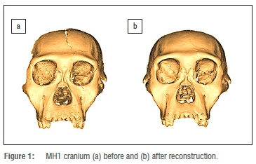 The 3D model of the MH1 cranium was first imported into Rapidform®, and all adjustments were conducted in 'mesh mode'. It was decided that the most efficient and effective way to account for cracks and displacements was by selecting the affected areas that required adjustment, copying and pasting these regions into a separate window, and then re-aligning the selected area with the original model. The selected areas were reoriented using the 'scan tools' property and 'align between scan data'. Using these tools, one selects a reference scan and a moving scan, which are then aligned in accordance with selected analogous points that serve to stitch the scans together.