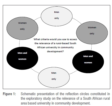Reflection circles (Figure 1) were constituted for data collection purposes. Table 1 shows the breakdown of the number of students in each reflection circle. When constituting the reflection circles, the sex of the students was used as a stratification variable. It was assumed that the views of male and female students might differ. Six reflection circles were constituted: men (2 groups), women (2 groups) and mixed men and women (2 groups). Each reflection circle deliberated on the same question, namely: 'What criteria would you use to assess the relevance of a rural-based South African university in community development?'