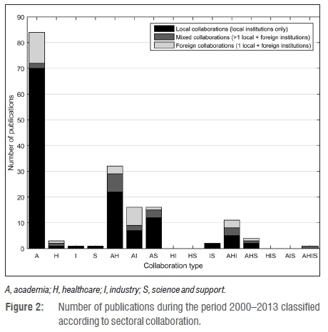 Publications were sorted according to the type of sectoral collaboration each represented. The number of publications thus found was further divided to show collaborations that involved only local institutions; mixed collaborations with more than one local institution and additional foreign involvement; and, foreign collaborations (a single local institution collaborating with foreign institutions). The proportions of the local, mixed and foreign collaborations are indicated in Figure 2.