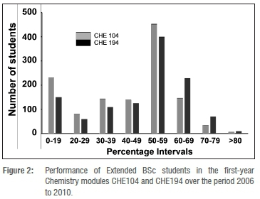 The performance of students in the Chemistry modules within the Extended BSc Programme is of relevance in this study. In 2005 - the first year of the programme - 134 students registered for CEM108, a 32-credit Chemistry module. Of these students, 36.5% passed the CEM108 module. In 2006, the CEM108 module was split into two 16-credit modules, i.e. CHE104 (Inorganic and Analytical Chemistry) and CHE194 (Physical and Organic Chemistry). The performance of the 1149 students registered for these modules during 2006 to 2010 is presented in Figure 2. The pass rates for the CHE104 and CHE194 modules were 55.4% and 61.4%, respectively. The marginally better performance in CHE194 could be the result to the fact that CHE104 was a prerequisite for CHE194.