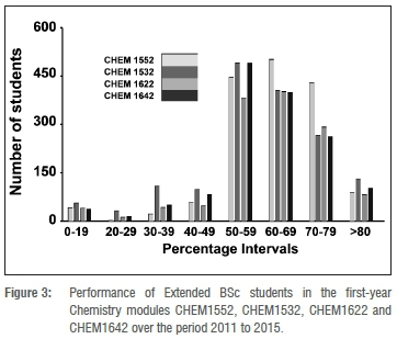 In 2011, first-year Chemistry for the Extended BSc Programme was split into four modules: CHE112 (Introduction to Chemistry: A foundation module) and CHE132 (Organic Chemistry) in the first semester, and CHE122 (Physical Chemistry) and CHE142 (Inorganic and Analytical Chemistry) in the second semester. CHE112 contributed 8 foundation credits, whereas the other three each contributed 8 mainstream credits. Because of administrative restructuring at the UFS in 2014, the module codes were changed as follows: CHE112 to CHEM1552, CHE132 to CHEM1532, CHE122 to CHEM1622 and CHE142 to CHEM1642. The first semester CHEM1552 and CHEM1532 modules, as well as either the foundation Mathematics module, MATD1554, or an achievement Level 4 in Mathematics in the final Grade-12 NSC examination, are prerequisites for the second semester CHEM1622 module, whereas CHEM1532 is excluded as a prerequisite for CHEM1642. The students in the Extended BSc Programme performed satisfactorily in these first-year Chemistry modules (Figure 3). For the period 2011 to 2015, the pass rates for the first-semester CHEM1552 and CHEM1532 modules were 92.1% and 81.2%, respectively, and the pass rates for the second-semester CHEM1622 and CHEM1642 modules were 88.8% and 87.0%, respectively. It is interesting to note that the BSc Extended students performed better than the UPP students4 in the first semester (92.1% vs 84% for CHEM1552; 81.2% vs 77.7% for CHEM1532), but that the UPP students were on par with the BSc Extended students in the second semester (87.9% vs 87.0% for CHEM1642; 91.1% vs 88.8% for CHEM1622).
