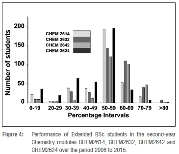 Of the 2995 students in the Extended BSc programme during the period 2005 to 2015, 14.0% registered for at least one second-year Chemistry module. The reason why some students registered for only one Chemistry module can be ascribed to some degree programmes in the Faculty of Natural and Agricultural Sciences requiring only a specific Chemistry module. The performance of the Extended BSc students in the second-year Chemistry modules is given in Figure 4. The pass rates for the first-semester modules CHEM2614 (Physical Chemistry) and CHEM2632 (Analytical Chemistry) were 71.2% and 80.8%, respectively, and the pass rates for the second semester modules CHEM2642 (Inorganic Chemistry) and CHEM2624 (Organic Chemistry) were 89.0% and 57.6%, respectively.