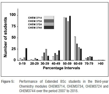 Only 6.5% of the 2995 Extended BSc students over the sample period registered for at least one third-year Chemistry module. The pass rates in the first-semester third-year modules CHEM3714 (Analytical Chemistry) and CHEM3734 (Physical Chemistry) were 86.5% and 79.5%, respectively, and the pass rates for the second-semester third-year modules CHEM3724 (Inorganic Chemistry) and CHEM3744 (Organic Chemistry) were 68.4% and 72.4%, respectively. Figure 5 shows the performance of the students in the four third- year Chemistry modules.