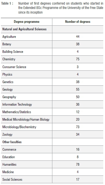 The success of the programme is measured in terms of the number of students who graduate. Of the 2995 students, 20.3% (609 students) obtained a first degree over the sample period. Of these, 486 students (16.2%) obtained a first degree in the Faculty of Natural and Agricultural Sciences and 123 students (4.1%) registered in other faculties after the first year in the programme and obtained a first degree in those faculties. Table 1 shows the number of first degree graduates in the different study programmes. Of the graduates, 135 proceeded to an honours degree and 15 of those completed a master's degree. No student in this sample completed PhD study. A number of the graduates chose education as a career and proceeded to a Postgraduate Certificate in Education; 42 graduates (1.4%) obtained this postgraduate teaching certificate.