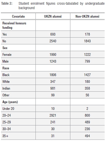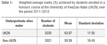 The results in Table 1 suggest that students who completed an undergraduate degree at UKZN performed significantly better in the UKZN honours programme than those who completed undergraduate studies at another university (f=12.185). Perhaps a significant number of the students who transferred from another university were weaker students who were refused entry into an honours programme at that university. There may also be other reasons for such an anomaly. For example, the demographic breakdown shown in Table 2 indicates that the students from other universities were older than those who entered from a UKZN undergraduate programme.
