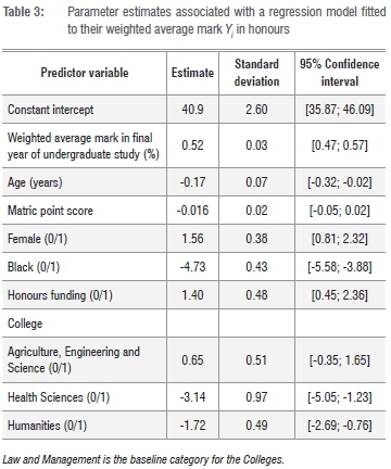 For the interpretation of Table 3, 'female' refers to a 0/1 indicator variable that is set equal to 1 for a female student. 'Black' refers to a 0/1 indicator variable that is set equal to 1 for a black student. Similarly, 'honours funding' refers to a 0/1 indicator variable that is set equal to 1 for a student who has managed to obtain some form of external funding for honours study. Because UKZN is composed of four colleges (College of Agriculture, Engineering and Science, College of Health Sciences, College of Humanities and College of Law and Management Studies), indicator variables for the first three colleges were included as covariates in Table 3 with an effect for the College of Law and Management Studies forming part of the intercept term in the above model structure. These covariates were chosen based on previous research23-26 at UKZN that has identified them as being important predictor variables for determining performance at UKZN.