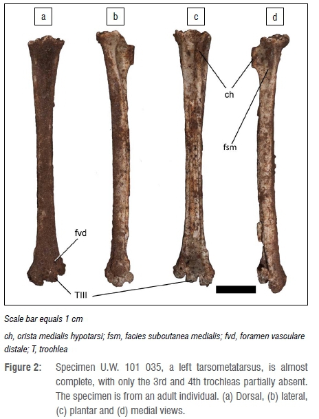 The most complete of these specimens, specimen U.W. 101 035 (Figure 2), a left tarsometatarsus, was used for skeletal measurements. This specimen is almost complete, with only the 3rd and 4th trochleas absent. The specimen is from an adult individual. The morphology of the proximal articulation distinctly places the specimen in the Strigiformes order, which consists of various species of owls. The morphology of the proximal articulation is identical to that of the extant barn owl (Tyto alba). This is supported by the greatest length of the specimen, which is also most similar to the barn owl (Table 1) among Strigiformes examined in this study. Very large- and small-sized owl species are not included because of the substantial adult size differences in these bones. In owls, the distal trochlea is similar in proportions. The presence of the 2nd trochlea is a reflection of maximum length.