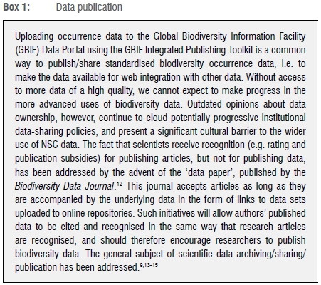 Properly and efficiently managing the biodiversity research data described above presents technical and organisational challenges arising from the rapid development of technology. Researchers' or technicians' data management skills do not always match the increasingly stringent requirements to organise and store data from the broad and diverse array of biodiversity projects conducted by the South African research community. These requirements are both technical and administrative (e.g. that data should be available for others to use). How can we improve biodiversity data management, integration and utilisation (e.g. how should students collaborate with their supervisors to share data, especially when they are not on the same campus)? Where should the data be stored and who should be responsible for data storage and long-term data preservation? Which data standards should be used? What conditions should be associated with using the data? Below we describe some of the challenges that the broader community of biodiversity scientists could face in developing greater capacity, specifically to manage and meaningfully use biodiversity occurrence data.