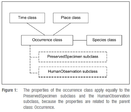 To comprehensively characterise the context of data, sampling events and occurrences must be represented using a coherent conceptual model. At a higher level of conceptual abstraction in this model, physical specimens and human observations are represented by the same properties of metadata classes. After all, a bird (occurrence) may have been seen during a sampling event at a particular place, whether or not the bird was captured or preserved as a specimen (Figure 1).