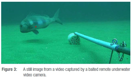 An important SAIAB research project typifies the kind of biodiversity occurrence data in the South African community that need to be brought under formal data curation, namely the work on Baited Remote Underwater Video (or BRUV, another research platform offered by SAIAB)22, and the closely related work on marine macrobenthos imagery23. The data will inform better decisions about the management of reef ecosystems and fish resources. In this underwater camera-trap and photo-quadrat sampling work, collection of physical specimens is not among the objectives. The BRUV videos and still images (Figure 3) of subtidal reef fish and macrobenthos are associated with (meta)data that are used to assess fish assemblage structure, including species composition, abundance and size. The number of fish observed is recorded and the lengths of some of these are measured (if stereo cameras are used). Standard spatio-temporal metadata (place and time) as well as instrument settings are also recorded.