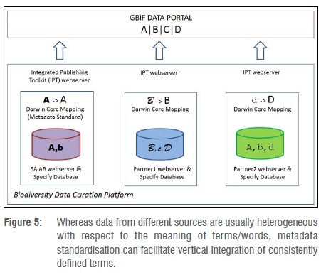 The Biodiversity Data Curation Platform includes a tool to publish data, but the platform allows the NSC museum clients to execute information management functions independently and according to their own procedures and policies. The Integrated Publishing Toolkit (IPT) was developed by GBIF to simplify the process of publishing standardised biodiversity data on the GBIF Data Portal. At the national scale, fish and invertebrate sampling protocols may be differently designed and metadata classes differently defined from project to project, and this could complicate the storage, management, sharing, analysis and interpretation of data. Use of the Biodiversity Data Curation Platform could therefore be a first step to remedy this semantic heterogeneity, by allowing different users to manage their data independently but in a way that will allow the data to be vertically integrated (Figure 5) through the use of biodiversity information standards (specifically the Darwin Core metadata terms24).