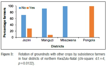 The majority of groundnut farmers did not practise crop rotation: 71%, 92% and 100% in Jozini, Manguzi and Mbazwana, respectively, did not rotate their groundnuts with any other crop (Figure 3). Only farmers in Pongola (100%) practised crop rotation (Figure 3) and therefore crop rotation and groundnut-farming districts were dependent on each other (p=0.0122). Farmers in all districts did not rotate maize with other crops (data not shown), but a variety of crops including beans, groundnuts and pumpkins were intercropped with maize. Maize was widely intercropped with groundnut in the Manguzi and Mbazwana Districts by 53% and 92% of farmers, respectively. Some farmers in all surveyed maize districts only planted maize (data not shown). Intercropping and the districts in which maize farmers were surveyed were, therefore, dependent on each other (p<0.001) (data not shown). Only farmers in the Pongola District did not intercrop groundnuts with other crops, whereas farmers in the other districts intercropped with crops such as spinach (Spinacia oleracea L.) and cowpeas (Vigna unguiculata L.) (data not shown). Therefore, intercropping was dependent on the groundnut-farming districts surveyed (p=0.0071) (data not shown).