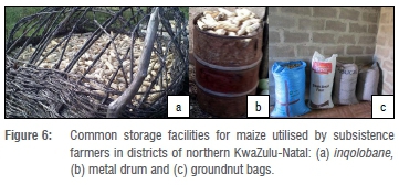 A type of storage facility widely used in all the northern KwaZulu-Natal districts surveyed was an inqolobane, which is the isiZulu name for a widely ventilated wooden storage facility (Figure 6a). Metal drums were used by maize farmers only; some metal drums were ventilated and others unventilated (Figure 6b). Groundnuts were planted in small quantities in comparison to maize, hence groundnuts were easily and most commonly placed in bags which were stored in the farmers' homes (Figure 6c). In fact, in all the groundnut-farming districts (Jozini, Manguzi and Mbazwana), farmers stored groundnuts in their homes only (data not shown). Metal tanks were used to store maize by some subsistence farmers in Jozini, Pongola and Vryheid (Figure 7). The storage facilities and maize districts surveyed were dependent variables (p=0.0014).