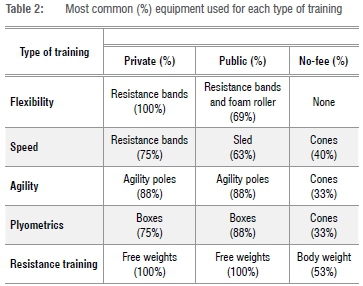 Flexibility, speed, agility, plyometrics and resistance training were the most common practices. The most common types of equipment used for these training exercises are shown in Table 2.