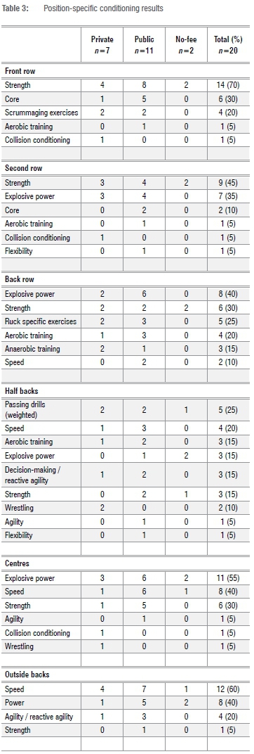 3.Rugby specific: This section dealt with rugby-specific strength and conditioning related questions that gave insight into position-specific practices.
