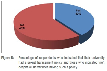 The results in this study which show the existence of a belief that lecturers and students engaged in sexually inappropriate relations are in fact consenting adults in reciprocal relations have not been explored sufficiently.10 Although policies on sexual harassment exist in all the IHLs from which respondents graduated, Figure 5 shows that the existence of these policies was largely unknown to many (60%) former students, although some may have graduated before such policies were put in place.