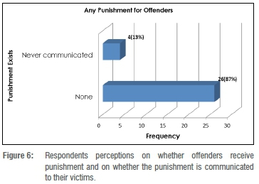 Figure 6 also shows respondents' views regarding punishment meted out to STM offenders. Most (87%) respondents felt nothing was done to offenders despite exposés, hence STM perpetuates. However, others felt punishment was meted out but never communicated to the victim (13%). Neither scenarios help deter future incidents.