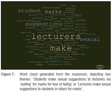 Students cited that a lecturer would ask them to collect assignments from their office instead of returning them at class. Some students would even be victimised by being made to repeat courses if they failed to comply with the demands of the sexual advances of the staff member. Students denoted this practice as 'a thigh for a mark' or sex for grades.31-33