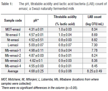 The pH range for emasi (Table 1) was 4.31-5.03. Although there were variations in pH of the samples, the deviations were not significant (p>0.05). The differences in varying values of pH in Table 1 may be attributed to the variations in the amount of available substrate for LAB to ferment, the type and quantity of predominant fermenting LAB (emasi production often involves back-slopping), and the duration of fermentation.