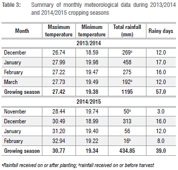 The highest rainfall received in the 2013/2014 season was in January (458 mm) when 37% (171 mm) of rainfall was received in 1 day. Unlike in January, rainfall in February was evenly distributed throughout the month with nearly the same number of rainy days between cropping seasons (Table 3). The month of March had a total rainfall of 192 mm with 99% (190.5 mm) of this rainfall occurring within the first 13 days of the month. Most of the rainfall in the second season occurred in December, with frequent rainfall occurring at the middle and towards the end of the month.