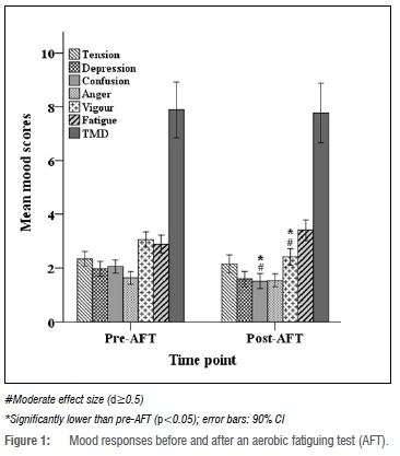 Mood states were evaluated pre- and post-AFT by using the Incredibly Short Profile of Mood States (ISP) questionnaire derived from the original Profile of Mood States questionnaire21 by Dean and colleagues22. The ISP consists of six questions targeting the same subscales (involving anger, depression, tension, confusion, fatigue and vigour). Correlations between the two questionnaires (r=0.67-0.82)22, as well as between the six subscales (r=0.72-0.83), have been reported previously23. The participants rated the questions on a five-point Likert scale from 1 ('not at all') to 5 ('extremely'). Individual scores for each subscale were the rating indicated per question and the TMD score was calculated by adding the negative and subtracting the positive scales.