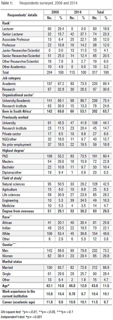 Two waves of data were used. One was collected in 2008 and the other in 2014. In both waves, sample respondents were drawn from two higher learning institutions and four research institutes in the province of KwaZulu-Natal in South Africa. There were 22 science departments (in the disciplines of agricultural science, engineering science, life sciences, natural sciences and medical sciences) in the selected institutions. As we intended to have as many respondents as possible, all those who were employed in these departments were approached for a face-to-face interview, using a structured interview schedule. Race and gender were self-described by respondents. Ethical clearance was obtained from the University of KwaZulu-Natal (ref. HSS/0336/014).