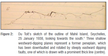 Alexander Logie du Toit (1878-1948) was South Africa's most famous geologist during his lifetime, having authored five books which brought him world renown. In December 1937 to January 1938, accompanied by his wife Evelyn, he visited India in order to attend the Jubilee Indian Science Congress in Calcutta and to do field work in coal and diamond mines. On the return journey to Africa by ship, they stopped for a few hours in Port Victoria on Mahé Island in the Seychelles archipelago. They also passed by Silhouette Island. Du Toit recorded his activities in a diary, and his geological observations in a notebook, where he also drew a sketch of Mahé, and recorded steep structures on the east coast of Silhouette. Although he had not visited the Seychelles before, his deep understanding of the problems of Seychelles geology resulted from his comprehensive research on Indian Ocean geology for his 1937 book Our Wandering Continents. He made remarkably accurate observations on the geomorphology and structure, some of which were only confirmed decades later when the Seychelles were mapped in the 1960s to 1990s. His bold and prescient ideas on the breakup of the Gondwana continent, and on the formation of the Indian Ocean, have been amply confirmed by modern studies, especially by those of Lewis D. Ashwal and his collaborators.