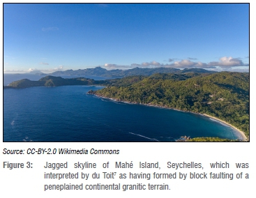 He was quite alert to the possibility that the jagged outline of these rocks (Figures 2 and 3) could represent a formerly peneplained continental region which had been broken up by block faulting. His observations on the steep structures on Silhouette Island were confirmed many years later by Stephens8 who showed that on the east coast of Silhouette there is a north to north-northwest trending trachytic breccia traversed by steep trachytic, microgranitic and microsyenitic dykes (which have been dated at between 64 Ma and 63 Ma)9. In 1937, in his magnum opus Our Wandering Continents5, du Toit wrote, what we now know, in hindsight more than 80 years later, to be a breathtakingly daring, intricately detailed and presciently accurate account of the geological setting and palaeogeographic positions of Madagascar, the Seychelles, Mauritius and the Mascarene Plateau, and India, in relation to the breakup of the Gondwana continent and the formation of the Indian Ocean. This is what du Toit wrote, in part, about the Indian Ocean, based on his comprehensive and detailed researches5(p.226-227):