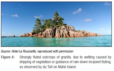 Fine group of islands made by bare crystalline rocks, often black through crust of lichens. At north end of Mahé, Port Victoria, there is a remarkably regular sheeting of the granite dipping SW at about 15° or so [Figures 2 and 3]. Granite without any marked gneissic structure or banding. In Silhouette Island to the NW there are indications of some structure standing at a high angle and trending rudely NNW. (Extraordinary is the small and large scale fluting of the solid granite, visible in Mahé Island, visible even in crags high up in the range, due to wetting caused by dripping of vegetation or guidance of rain down incipient fluting) [Figure 4]. Noticeable is the long axis of Mahé parallel to this same direction. The group of islands rises from a shelf with relatively shallow water which, at least on NW side (track to Mombasa) has an extremely sharp edge. Its north margin is outlined by shoals and islands.