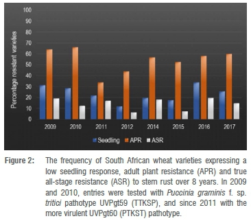 In recent decades, notable events and initiatives in South African wheat rust research include annual surveys8, Sr24 virulence9, the appearance of stripe rust (caused by P. striiformis Westend. f. sp. tritici, Pst)10, Ug99 stem rust studies11-15, the mapping of quantitative resistance loci16,17, genetic characterisation of Puccinia isolates1820, comprehensive phenotyping of wheat germplasm, and establishment of a marker service laboratory with a particular focus on rust resistance genes (https://www.cengen.co.za).