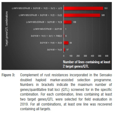 South African seed companies use different strategies to breed for rust resistance, dependent on their approach, resources and location. Yet there is a collective focus on pyramiding rust resistance genes, in particular those that confer durable APR, to uphold the international drive of gene stewardship. Sensako (Pty) Ltd., a private breeding company with headquarters in Bethlehem (Free State, South Africa), follows a strategy in which they combine target genes/QTL in doubled haploid donor lines. This is followed by a top cross with their elite lines or commercial cultivars and from the F1-generation doubled haploid lines are developed to integrate the genes/QTL into better adapted backgrounds. This approach has proven to be successful in pyramiding rust resistance genes/QTL (Figure 3). They have managed to develop a line containing multiple genes for resistance to all three rust pathogens, which is now used as a key donor line to incorporate complex resistance into existing cultivars.