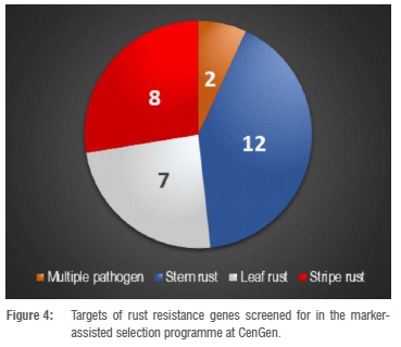 Marker-assisted selection (MAS) is widely accepted as a key strategy to pyramid resistance genes into wheat genotypes, in particular, genes that do not exhibit easily distinguishable phenotypes.72 In South Africa, large-scale MAS was not implemented by breeding companies in the early 2000s8, although it was routinely used to select for several traits in countries such as Australia, Mexico, USA, the UK and India72. In 2011, a proposal by CenGen (Pty) Ltd. titled 'Establishment of a molecular marker service laboratory for routine application of marker-assisted selection in South African wheat breeding programs' (WCT/W/2009/02), was approved for funding by the Winter Cereal Trust. The capital expense of establishing a MAS laboratory and routine maintenance justified a central facility at CenGen for all wheat breeding programmes. The project is based on (1) purity testing of donor lines and confirmation of the target trait, (2) planning of breeding schemes and crosses to transfer the new trait, and (3) tracking the trait in subsequent filial generations.