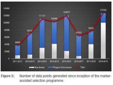 Molecular markers for target genes/QTL are obtained from the public domain and research articles, or from in-house mapping projects by CenGen and collaborators. These include simple sequence repeat (SSR), sequence-tagged site (STS), cleaved amplified polymorphic site (CAPS) and single nucleotide polymorphism (SNP) markers. Since 2013, the implementation and upgrade of KASP™ SNPLline™ instruments (LGC, UK) at CenGen greatly enhanced high-throughput capacity. The number of data points (calculated as the number of samples x number of markers tested per sample) that are generated annually continues to increase (Figure 5) despite a decrease in industry funding.