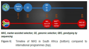 Notwithstanding the success of the implementation and application of the MAS programme for single locus traits such as rust resistance, the status of MAS in South Africa trails behind that of international programmes, which are exploring an integrated genomics-assisted breeding approach.74 In 2010, crop geneticists started to investigate genomic selection in wheat to select for complex, multi-locus traits.75 By 2012, reports of the value of genomic selection using genotyping-by-sequencing in wheat were published, creating yet another avenue for genomics-assisted breeding (Figure 6).76 The challenge remains for South African breeders and geneticists to follow international trends in genomics-assisted breeding and sensibly implement selection strategies for multi-locus traits.