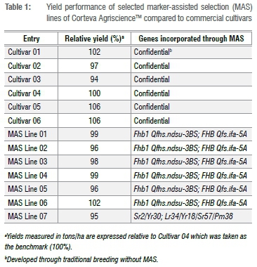 The South African wheat breeding programme of Corteva AgriscienceTM follows a more traditional approach of gradually incorporating multiple genes/QTL into their breeding lines. Gene enrichment is done at the F2-generation, and the presence of the target genes is confirmed in the F5-generation after three cycles of selection for agronomic traits. Pure lines containing the target genes are then either used to generate new resistance gene combinations or, if within the tolerance levels set for the different milling and baking quality criteria, are considered for commercial release. This programme has been successful in combining APR genes for stem, stripe and leaf rust resistance into elite breeding material that performs similarly to current commercial cultivars in yield trials (Table 1).
